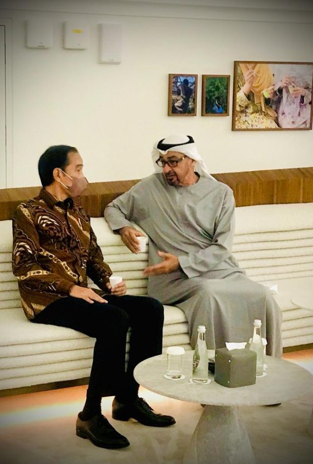 Dubai, Mediasakti.id,- Ada yang menarik saat Presiden Joko Widodo berkunjung ke Dubai Expo pada Kamis, 4 November 2021. Sesaat akan meninggalkan Paviliun PEA setelah melakukan peninjauan, Presiden Jokowi diminta oleh pengelola paviliun untuk meninjau ke lantai 2. Namun ternyata tak hanya melihat pameran, di salah satu sudut ruangan nampak sosok yang telah dikenal Presiden, yakni Putra Mahkota Abu Dhabi, Sheikh Mohammed Bin Zayed Al Nahyan (MBZ).