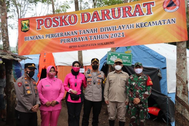 Bersama dengan Ketua Bhayangkari Cabang Sukabumi Ny. Hesti Dedy dengan didampingi oleh Kapolsek Purabaya Akp Tenda Sukendar, SH., MH dan Forkopimcam Kecamatan Purabaya serta relawan, Kapolres Sukabumi mengunjungi korban bencana alam yang masih tinggal ditenda pengungsian, Sabtu (06/11), Kapolres Sukabumi dan Ibu, harus berjalan kaki menyusuri jalan setapak melewati kebun dan pesawahan warga untuk mencapai lokasi pengungsian.