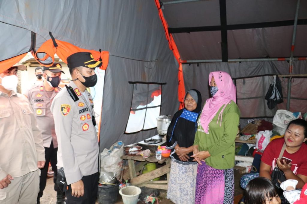 Ditenda pengungsian Kapolres Sukabumi selain melihat dan berbincang dengan para pengungsi juga menyerahkan bantuan sosial berupa paket sembako serta paket bantuan dari Bhayangkari Polres Sukabumi.