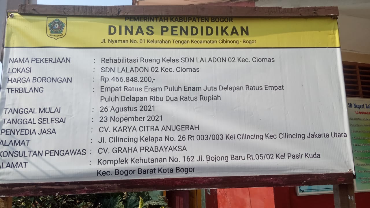Laladon-Kabupaten Bogor, Mediasakti.id – Proyek pembangunan (rehab) Sekolah Dasar Negeri (SDN) 02 Laladon Kec. Ciomas senilai Rp. 466.848.200,- Dalam pelaksaannya, pembangunan tersebut tidak sesuai dengan Rencana Anggaran Biaya (RAB) yang ada, Ciomas, Jum’at (12/11/2021).