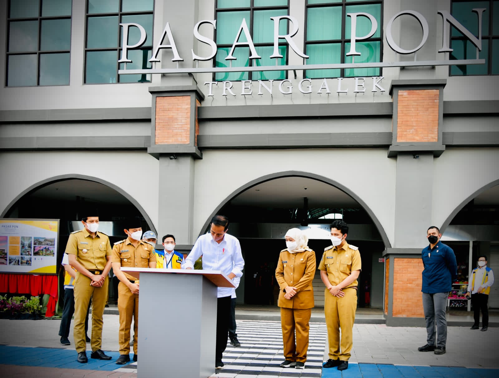 Setelah itu, Presiden bersama Menteri Pekerjaan Umum dan Perumahan Rakyat (PUPR) Basuki Hadimuljono, Menteri Sekretaris Negara Pratikno, Gubernur Jawa Timur Khofifah Indar Parawansa, Wakil Gubernur Jawa Timur Emil Dardak, serta Bupati Trenggalek Mochamad Nur Arifin berkeliling meninjau pasar tersebut.