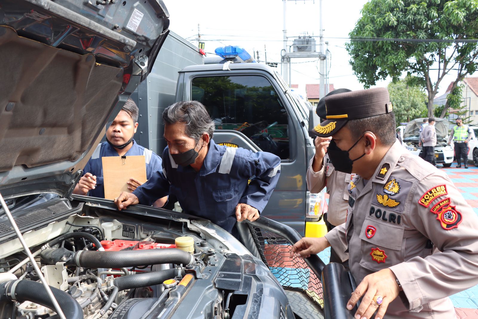 Nampak kendaraan roda empat dan kendaraan dinas Truk di periksa dengan cermat oleh Kabag Log. Mulai dari kebersihan kendaraan, oli mesin, lampu, serine dan sebagainya di pastikan harus terawat.