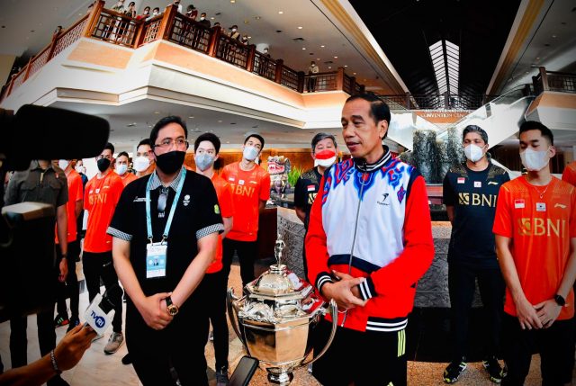 “Ini adalah sebuah prestasi yang telah ditunggu lama oleh seluruh rakyat Indonesia dan saya sekali lagi menyampaikan penghargaan yang setinggi-tingginya untuk Piala Thomas maupun untuk prestasi-prestasi yang lainnya yang tadi disampaikan oleh Bapak Ketua Umum PBSI,” ujar Presiden.