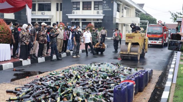 “Hari ini kami bersama Polres Sumedang bekerja sama dengan TNI dan Pembak Sumedang melaksanakan pemusnahan miras hasil operasi dari tanggal 15 hingga 20 Desember 2021. hasilnya kami berhasi menyita 2.600 minuman keras berbagai merek dan 187 liter tuak”. Ujar Kapolres