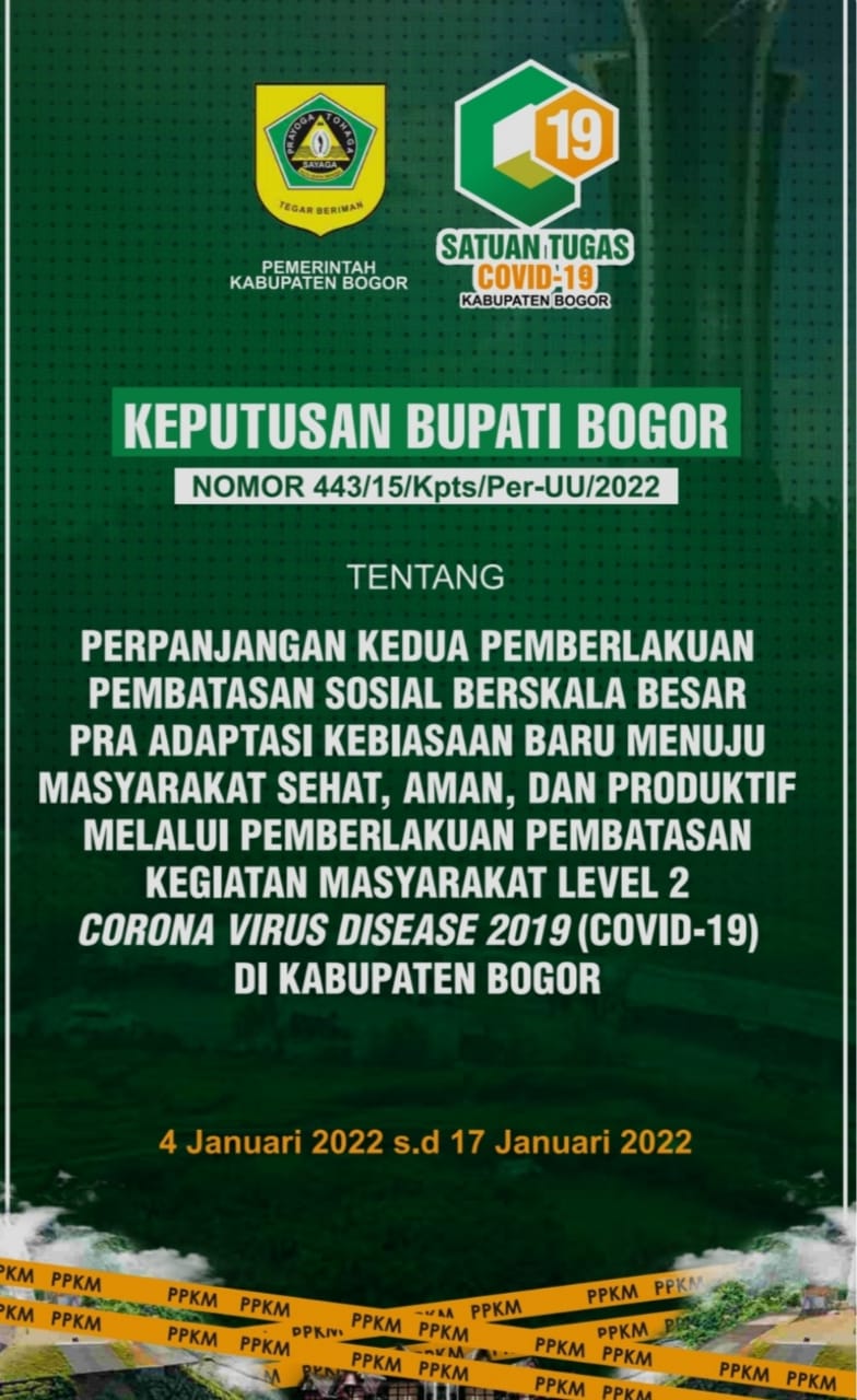Bupati Bogor, Ade Yasin menjelaskan bahwa selaras dengan kebijakan Pemerintah Pusat, Pemerintahan Kabupaten Bogor mengeluarkan aturan baru, melalui Keputusan Bupati Bogor Nomor 443/15/Kpts/Per-UU/2022 tentang Perpanjangan Kedua Pemberlakuan Pembatasan Sosial Berskala Besar Pra Adaptasi Kebiasaan Baru Menuju Masyarakat Sehat, Aman, dan Produktif Melalui Pemberlakuan Pembatasan Kegiatan Masyarakat Level 2 Corona Virus Disease 2019 (Covid-19) di Kabupaten Bogor.