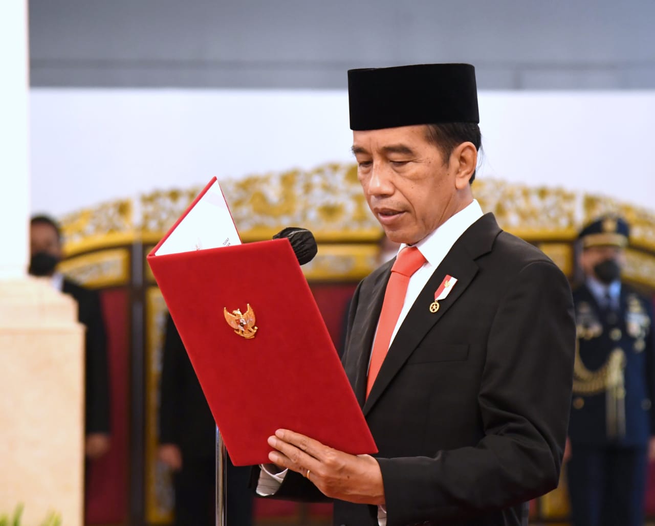 Selain itu, turut hadir secara terbatas ialah Menteri Koordinator Bidang Politik, Hukum, dan Keamanan Mahfud Md, Menteri Luar Negeri Retno Marsudi, Sekretaris Kabinet Pramono Anung, dan Direktur Jenderal Protokol dan Konsuler Kementerian Luar Negeri/Kepala Protokol Negara Andy Rachmianto. Redaksi A 01.