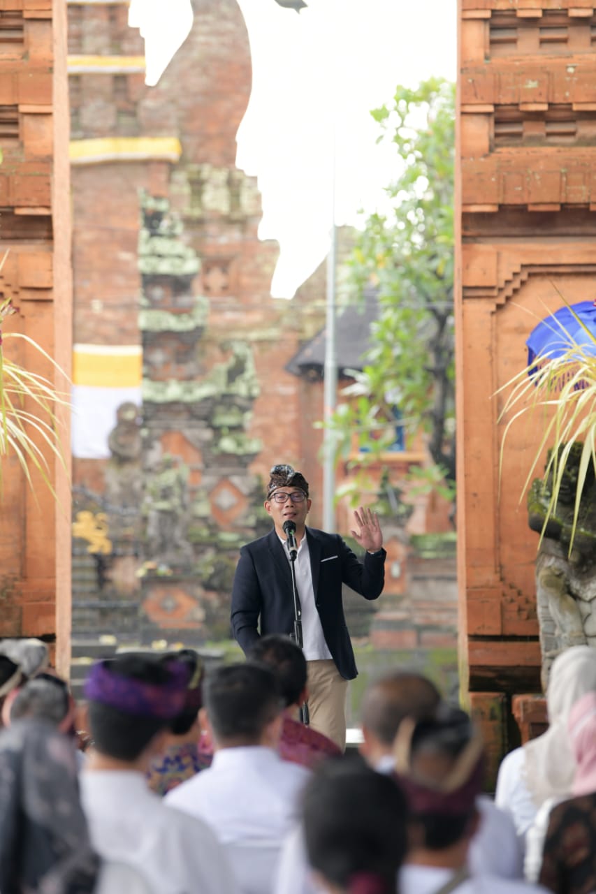 Gubernur Jawa Barat Ridwan Kamil beserta Wakil Gubernur Provinsi Bali Tjokorda Oka Artha Ardhana Sukawati menghadiri langsung peluncuran program ini di samping Pura Melanting, Pasar Badung Dangin Puri Kangin, Kota Denpasar, Bali, Selasa (18/1/2022).