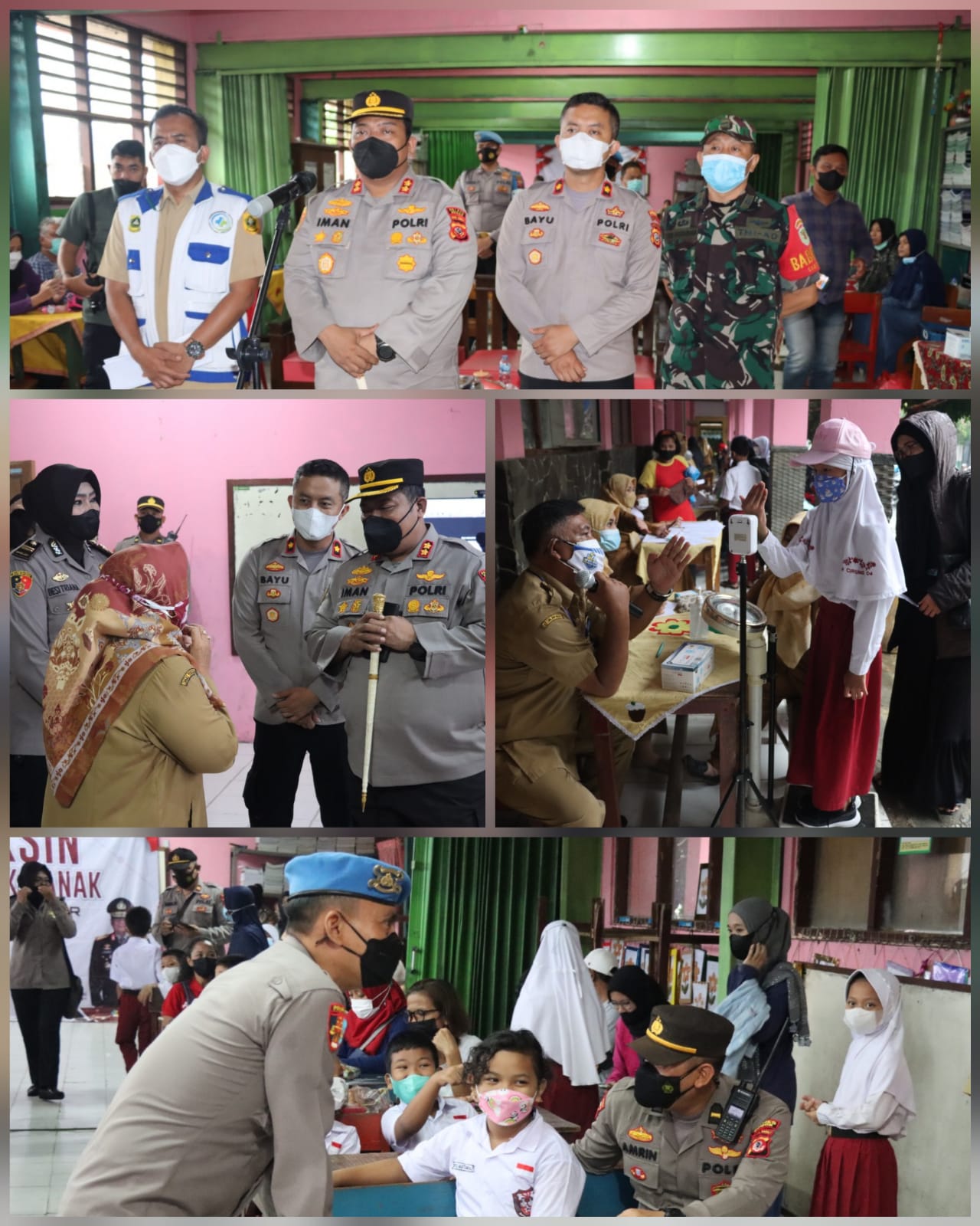 Cibinong-Kabupaten Bogor, Mediasakti.id – Polres Bogor, Kapolres Bogor AKBP Dr. Iman Imanuddin, SIK., SH., MH didampingi Kasat Binmas Polres Bogor AKP Irrine Kania Devi, SIK dan Kapolsek Cibinong Kompol Bayu Tri Nugraha, SE, SIK, MM,. meninjau langsung kegiatan vaksinasi di SDN Ciriung 04, Cibinong, Selasa 8 February 2022.