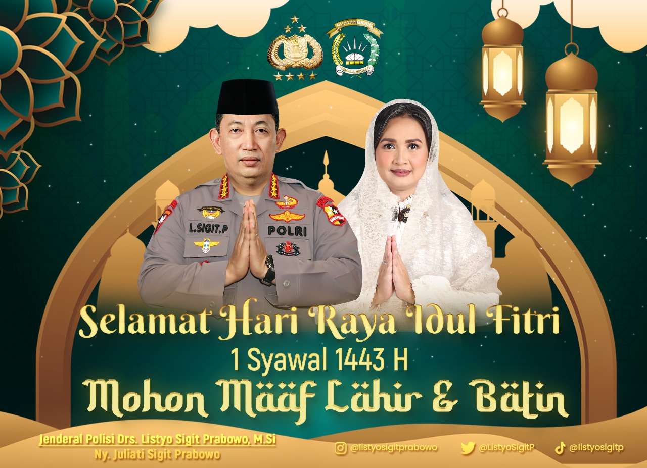 “Di tengah gema takbir yang berkumandang di hari fitrah, saya Jenderal Polisi DRS. Listyo Sigit Prabowo, M.SI Kepala Kepolisian Negara Republik Indonesia (Kapolri), mengucapkan selamat Hari Raya Idul Fitri 1443 Hijriah. Minal Aidin Wal Faizin, mohon maaf lahir dan batin, kepada seluruh umat muslim di Indonesia,” kata Sigit dalam tayangan videonya, Minggu (1/5/2022).