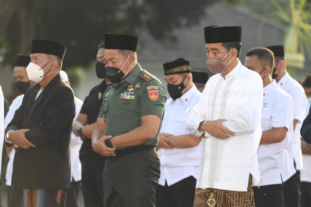 Yoyakarta, Mediasakti.id,- Presiden Joko Widodo dan Ibu Iriana Joko Widodo melaksanakan salat Idulfitri di halaman Gedung Agung, Istana Kepresidenan Yogyakarta, pada Senin, 2 Mei 2022, bertepatan dengan 1 Syawal 1443 Hijriah. Salat Idulfitri tersebut diselenggarakan secara terbatas dan diikuti perangkat kepresidenan, Paspampres, dan keluarga pegawai Istana Yogyakarta.