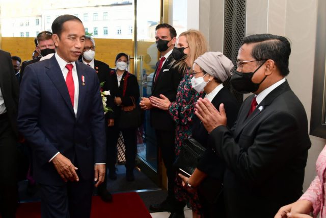 Selanjutnya, Presiden dan Ibu Iriana beserta rombongan menuju ke hotel tempatnya bermalam dengan menggunakan kendaraan mobil. Setibanya di hotel, tampak ratusan masyarakat Indonesia yang membentangkan bendera merah putih meneriakkan “Pak Jokowi… Pak Jokowi”, sudah menanti kedatangan Presiden Jokowi.
