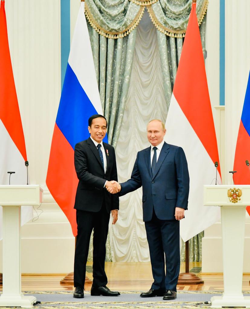 “Isu perdamaian dan kemanusiaan selalu menjadi prioritas politik luar negeri Indonesia. Dalam konteks inilah, saya lakukan kunjungan ke Kyiv dan Moskow,” kata Presiden Jokowi saat menyampaikan keterangan pers bersama dengan Presiden Putin.