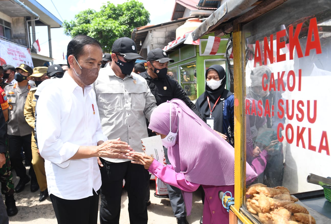 Selain penyerahan BMK dan BLT kepada peserta PKH, Presiden juga memberikan bantuan kepada para pedagang kaki lima dan pedagang pasar sembari berkeliling dan menyapa para pedagang.