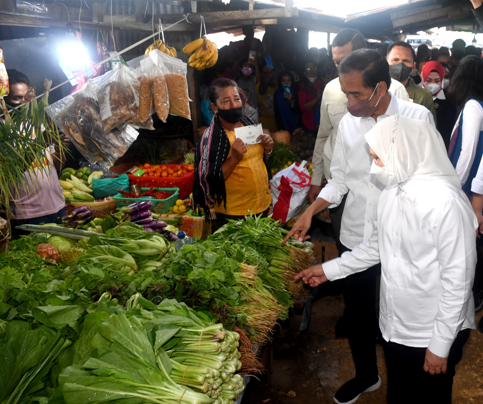 Menjelang tiba di pasar, ribuan warga menyambut kedatangan Presiden dan Ibu Iriana. Sebelum memasuki pasar, Presiden dan Ibu Iriana menyapa, berfoto, membagikan kaos, buku, dan masker kepada warga.