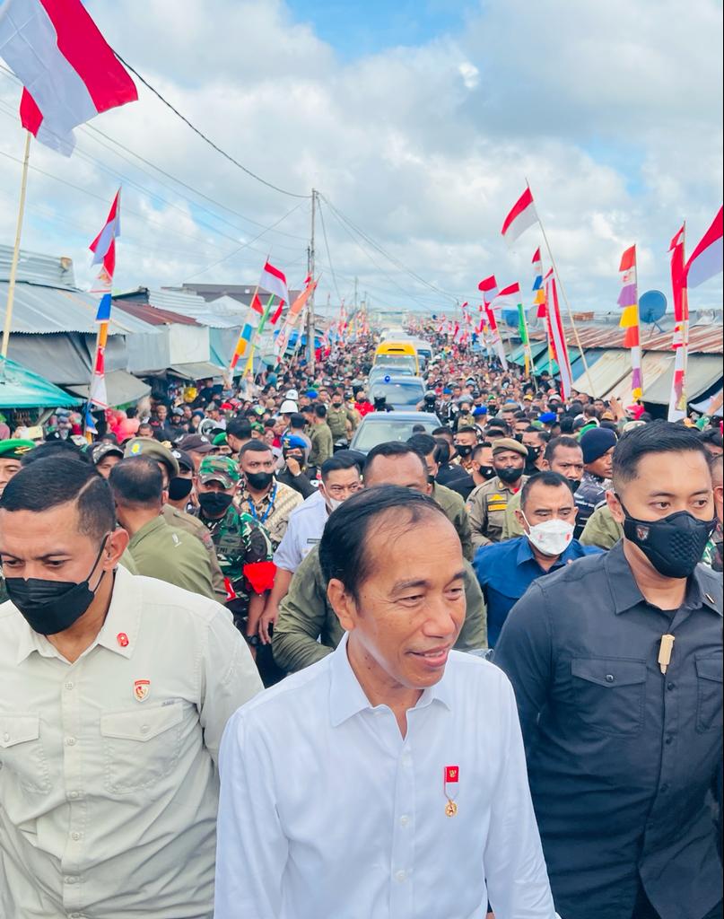 “Pak Jokowi… Pak Jokowi,” teriak warga sepanjang jalan dari mulai Bandar Udara Mathilda Batlayeri hingga hotel tempat menginap Presiden dan rombongan.