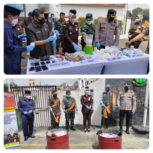 Adapun barang bukti yang kita lihat langsung dan di musnahkan yaitu berupa: Narkoba jenis sabu sebanyak 4,074 gram,Narkoba jenis ganja sebanyak 199 gram,Obat obatan berbagai jenis sebanyak 10.398 butir,Senjata tajam sebanyak 4 buah,Hp berbagai merk 20 buah,Timbangan digital 20 buah.Terang Kajari