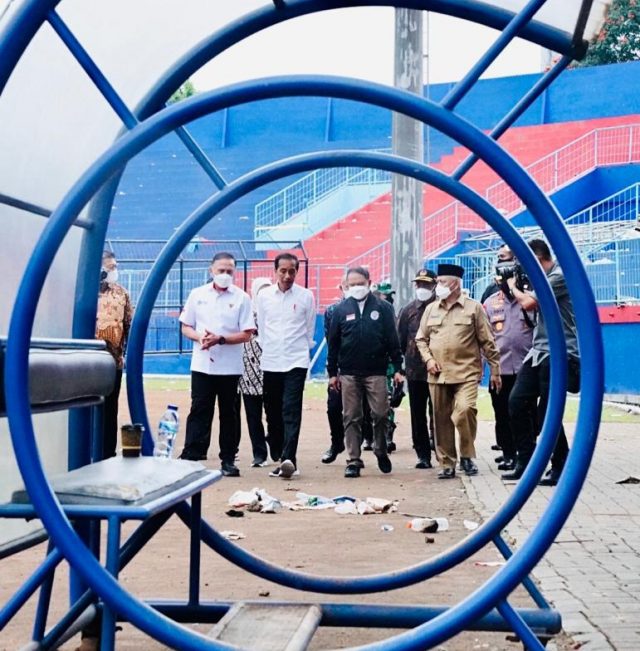 Malang, Mediasakti.id ,- Presiden Joko Widodo bersama Ibu Iriana Joko Widodo meninjau kondisi Stadion Kanjuruhan pascatragedi sepakbola yang terjadi pada Sabtu lalu (1-10-2022) guna mengetahui peristiwa yang terjadi saat itu. Usai meninjau kondisi stadion, Presiden memandang bahwa tragedi Kanjuruhan disebabkan oleh banyak faktor.