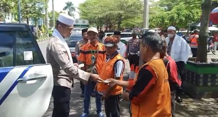 Kota Banjar, Mediasakti.id ,- Kapolres Banjar AKBP Bayu Catur Prabowo,S.H,S.I.K,M.M secara spontan membagikan uang kepada sejumlah tukang parkir dan tukang becak yang ditemuinya sesuai mengikuti upacara Hari Santri Nasional Tahun 2022 di Taman Kota Lapang Bhakti Kota Banjar, Sabtu (22/10/2022).