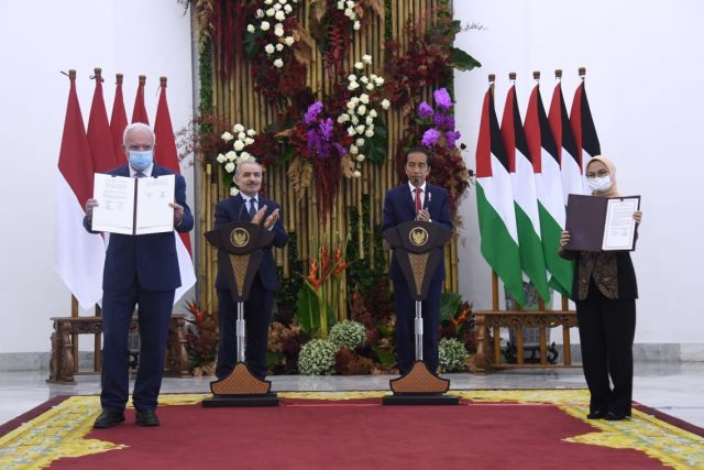 “Hari ini ditandatangani MoU pembangunan kapasitas untuk mendukung pendirian otoritas obat dan makanan independen di Palestina. Ke depan pemberian bantuan pengembangan kapasitas akan terus kita lakukan antara lain di bidang UMKM, e-commerce, dan penangangan bencana,” ujar Presiden.