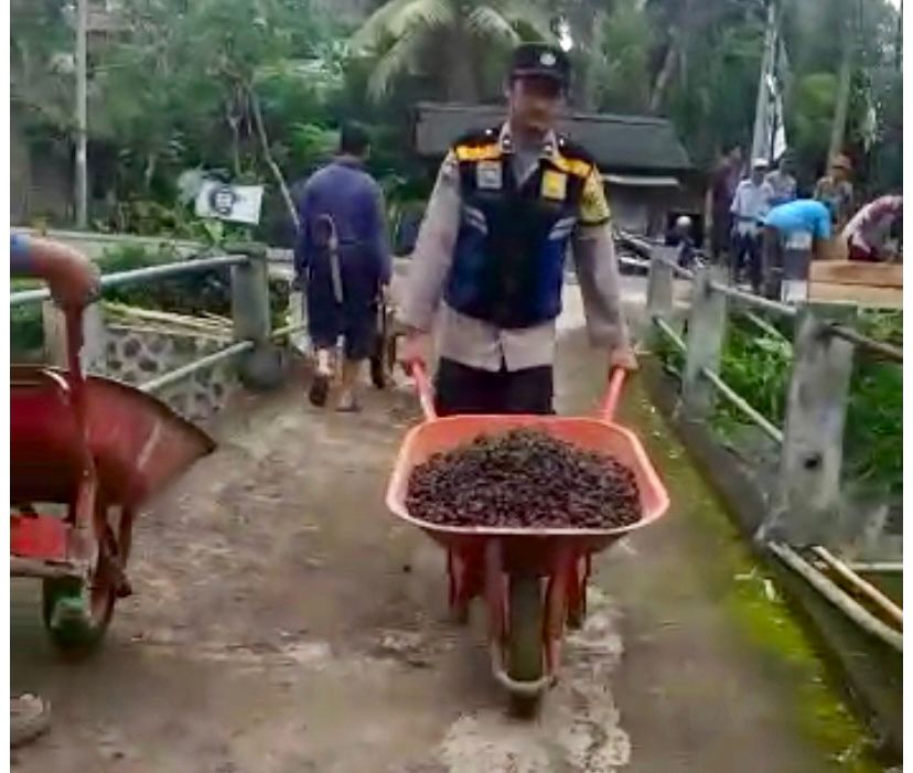 Tak hanya itu, anggota dilapangan juga membantu warga bergotong royong perbaikan jalan dusun. Gotong royong yang dilakukan berupa pengerjaan pengecoran jalan dan anggota membantu memindahkan material.