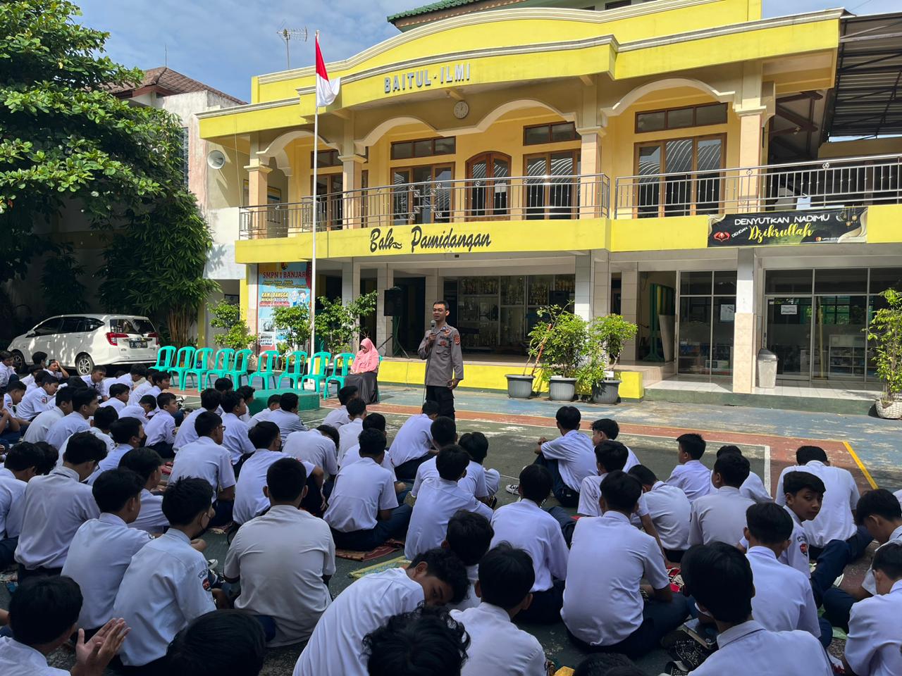 Kbo Binmas Ipda Budi Maryadi menyampaikan kegiatan silaturahmi kepada guru-guru dan siswa-siswi smpn1 kota banjar.