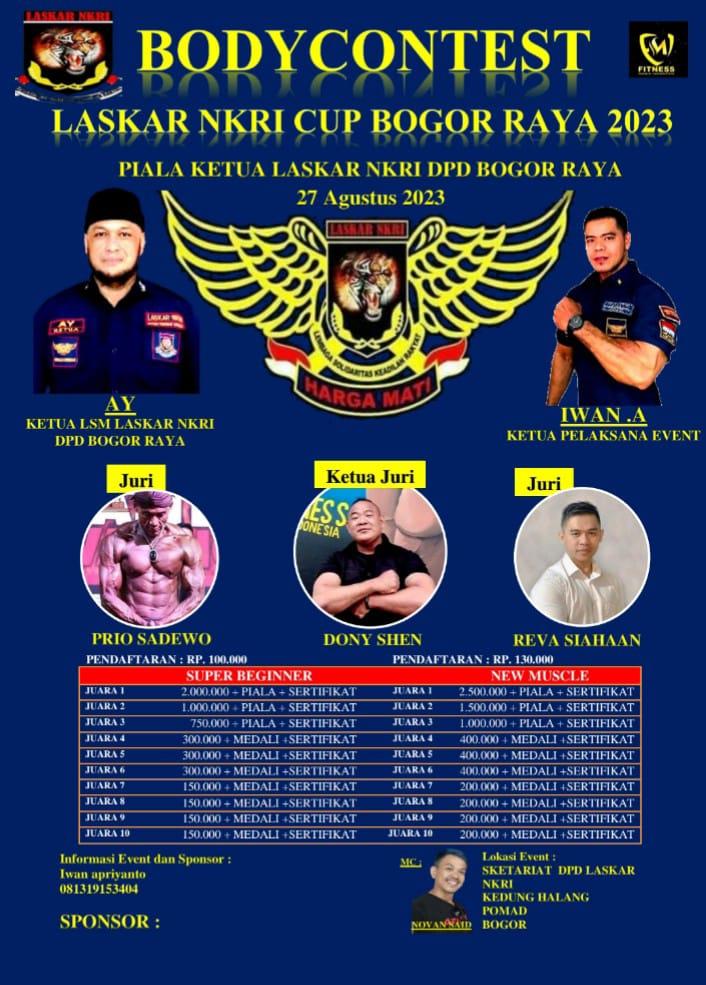 Berikut beberapa panitia pelaksana body contest. Iwan apriyanto sebagai ketua panitia. Dan untuk juri terdiri dari beberapa nama seperti. Doni shen, Reva siahaan, Arul dan Prio sadewo. Dalam acara kejuaraan ini bukan ajang saling mencari pamor atau nama beken seperti hal nya atlet nasional. akan tetapi supaya terjalin nya silaturahmi persatuan dan kesatuan yang kuat di dalam organisasi Laskar NKRI Bogor Raya ini.