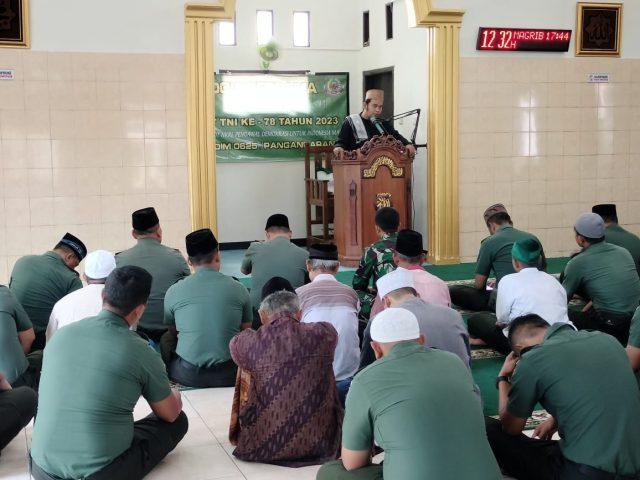 Pangandaran, Media Sakti.id ,- Dalam rangka menyambut HUT Ke 78 TNI Tahun 2023, Komandan Kodim 0625 Pangandaran Letkol Inf Indra Manrdianto Subroto, M. IP. Bersama seluruh anggota Kodim 0625 menggelar doa bersama, bertempat di Masjid Al Fallah Desa cintakarya Parigi Kab. Pangandaran. Senin (02/10/2023).