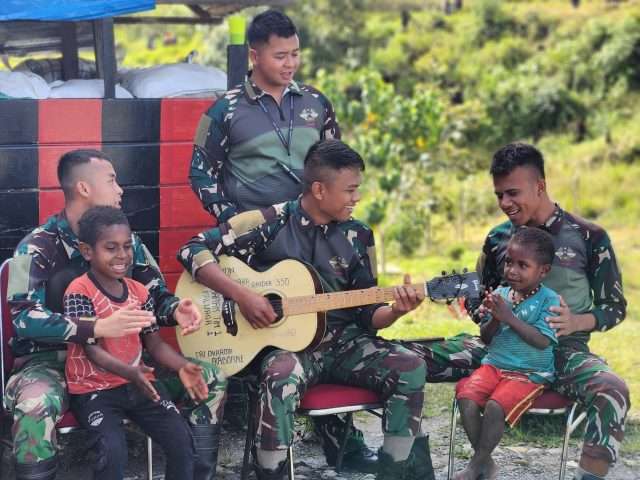 Intan Jaya, Media Sakti id,- Para Prajurit Satgas Pamtas Mobile Yonif 330 Tri Dharma selalu punya cara untuk membuat anak-anak Intan Jaya merasa nyaman dan gembira ketika berada didekatnya. Kali ini, dengan berbekal sebuah gitar, para Ksatria Tri Dharma bercengkerama dan mengajak para Bocah Papua bernyanyi bersama, bertempat di Kampung Mamba, Distrik Sugapa, Kab. Intan Jaya, Papua Tengah, pada Kamis (07/03/24).