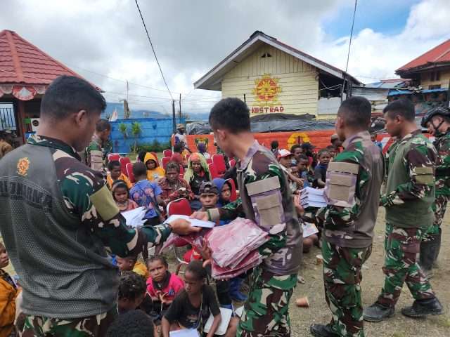 Intan Jaya, Media Sakti.id,- Di penghujung masa pengabdiannya di daerah penugasan, tak sedikitpun menyurutkan niat dan semangat Satgas Pamtas Mobile Yonif 330 Kostrad untuk terus melakukan aksi nyata dan hal positif yang manfaatnya dirasakan secara langsung oleh masyarakat di daerah penugasan. Seperti yang dilakukan pada Jumat (8/3/24), tatkala para Ksatria Tri Dharma menggelar program Jumat berkah dengan membagikan 200 buku tulis dan 50 Seragam Sekolah bertempat di Pos Japugau Janambani (J2), Kab. Intan Jaya, Papua Tengah.