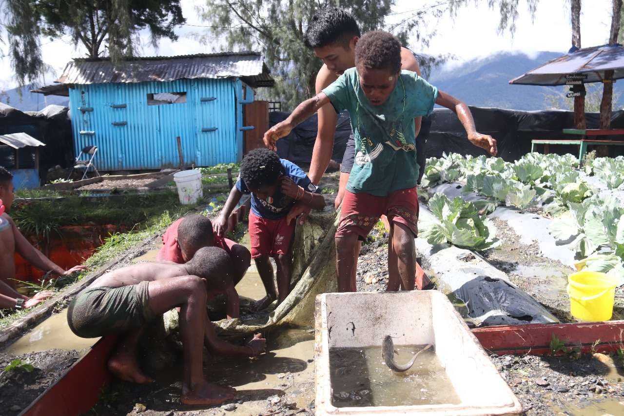 Kegiatan panen ikan lele di Pos Mamba berlangsung meriah. Tak hanya anak-anak, beberapa Mama Papua juga turut hadir dan menyaksikan proses panen raya monster afrika di perairan Mamba.
