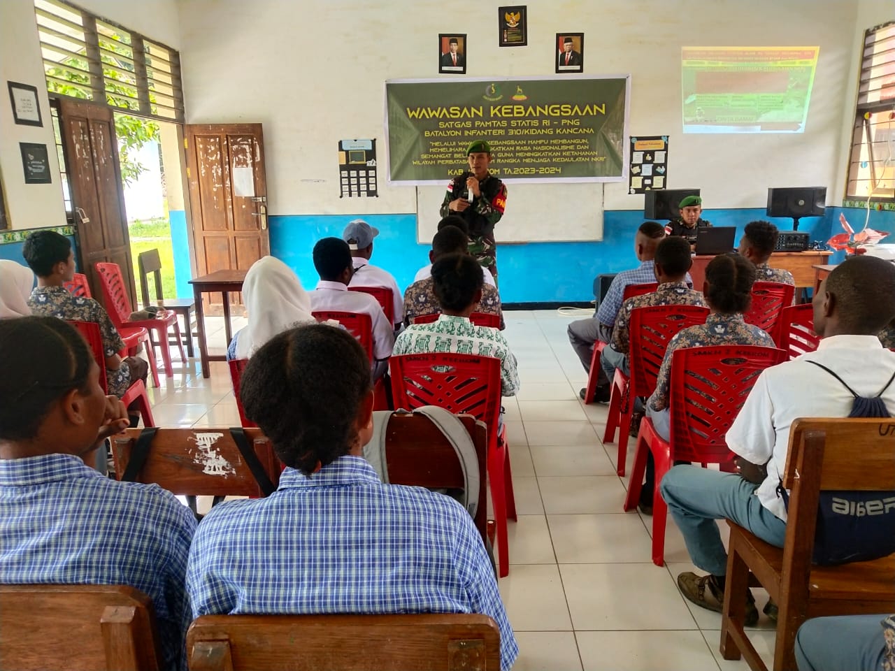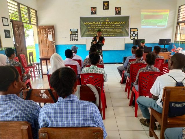 Keerom, Media Sakti.id,- Dalam rangka peringati Hari Lahir Pancasila serta tumbuhkan rasa cinta kepada bangsa dan negara para generasi muda diperbatasan, Pos Senggi Satgas Yonif 310/KK berikan Wasbang (Wawasan Kebangsaan) dengan materi 4 Pilar Kebangsaan kepada siswa-siswi SMKN 2 Keerom di Distrik Senggi Kabupaten Keerom, Papua, Kamis (30/5/2023l4).