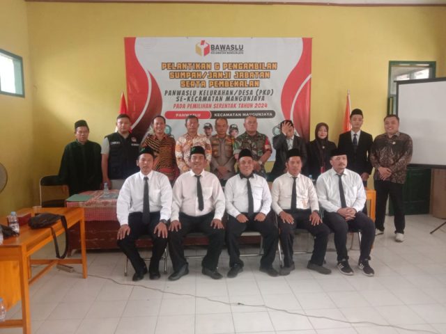 Kab Pangandaran, Media Sakti.id,- Untuk Pemilihan Kepala Daerah (Pilkada), 2024 bertempat di gedung Bumdes Desa mangunjaya Kecamatan Mangunjaya Kabupaten Pangandaran melantik lima ( 5 ) anggota Panwaslu Kelurahan / Desa.