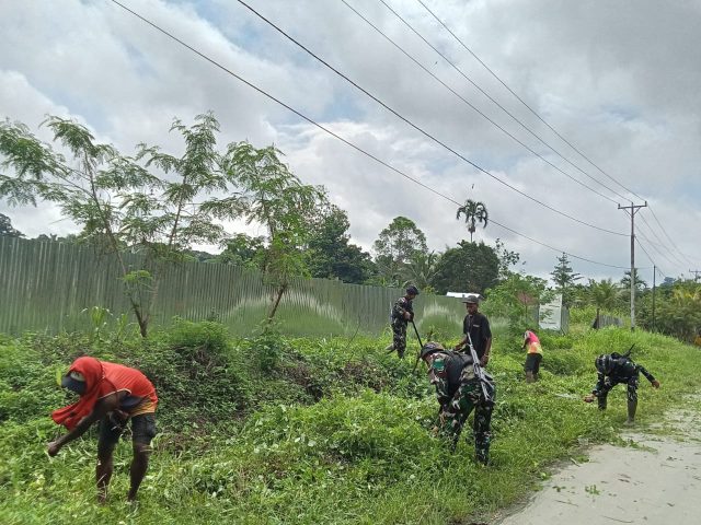 Keerom, Media Sakti.id,- Demi terciptanya lingkungan yang bersih, sehat dan asri, Pos Bompay Satgas Yonif 310/KK ajak warga bersihkan jalan kampung dan area lingkungan perumahan warga di Kampung Bompay, Distrik Waris, Kabupaten Keerom, Papua, Selasa (4/6/2024).