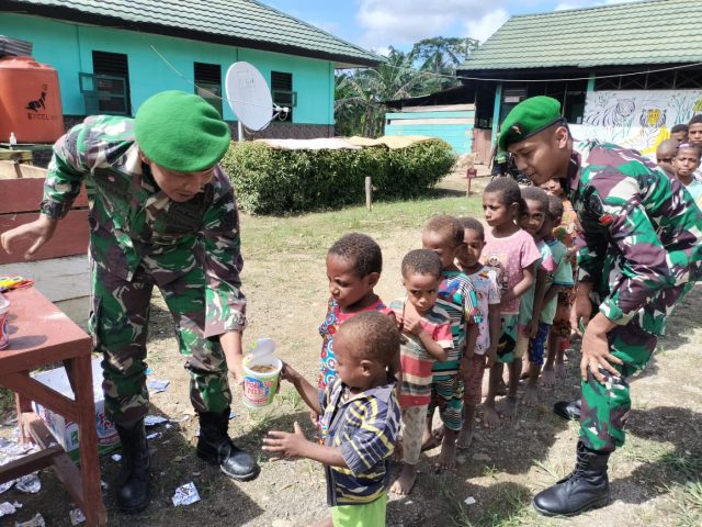 Keerom, Media Sakti.id,- Merayakan Hari Raya Idul Adha 10 Dzulhijjah 1445 H dengan sederhana di wilayah perbatasan RI-PNG, Pos Yabanda Satgas Yonif 310/KK mengundang warga khususnya anak-anak Papua untuk berbagi nikmat dan kebahagiaan dengan makan Pop Mie bersama di Kampung Yabanda, Distrik Yaffi, Kabupaten Keerom, Papua, Senin (17/6/2024).