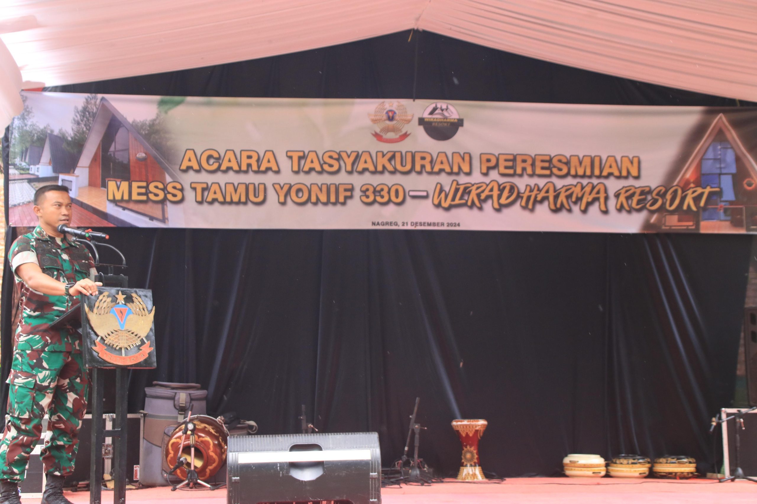 Nagreg, Media Sakti.id,- Danyonif 330 Tri Dharma, Letkol Inf Dedy Pungky Irawanto, S.I.P., M.I.Pol terus melakukan terobosan baru ide-ide kreatif dan inovatif dalam melaksanakan pembinaan satuan. Hal ini selaras dengan misinya yang kelima, yaitu meningkatkan kesejahteraan moril prajurit beserta keluarganya dengan menumbuhkan rasa cinta, rasa bangga, dan rasa memiliki terhadap satuannya. Yang terbaru, di bidang pembinaan pangkalan, Danyonif 330 telah meresmikan Wiradharma Resort, kompleks mess tamu berkonsep glamping pertama yang dimiliki oleh satuan setingkat batalyon di jajaran TNI AD, Nagreg, Cicalengka, Kab. Bandung, Jawa Barat, Sabtu (21/12/2024).