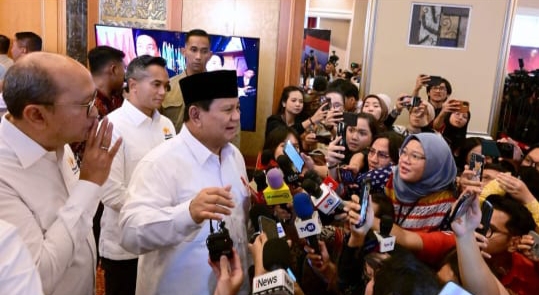 Presiden Prabowo menyampaikan keterangannya kepada awak media usai menghadiri Musyawarah Nasional Konsolidasi Persatuan Kadin Indonesia pada Kamis, 16 Januari 2025, di The Ritz Carlton, Jakarta. Presiden Prabowo Subianto menyampaikan komitmen pemerintah dalam memastikan seluruh anak-anak Indonesia mendapatkan asupan makanan bergizi melalui program makan bergizi gratis (MBG).