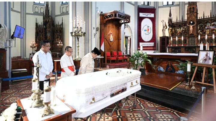 Presiden Prabowo Subianto melayat mendiang Uskup Emeritus Keuskupan Agung Kupang Monsinyur (Mgr) Petrus Turang di Katedral Jakarta, pada Jumat, 4 April 2025. Kepala Negara tiba di Katedral pada pukul 15.38 WIB.