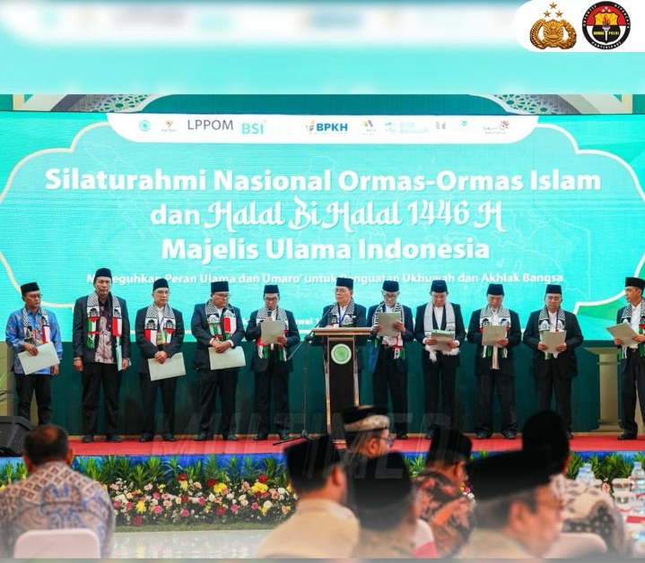 Kapolri Jenderal Polisi Drs. Listyo Sigit Prabowo, M.Si., menghadiri kegiatan silaturahmi nasional ormas-ormas Islam dan Halal Bihalal Idul Fitri 1446 Hijriah Majelis Ulama Indonesia (MUI) di Gedung Serbaguna 1 Asrama Haji, Jakarta Timur, Kamis (24/4).