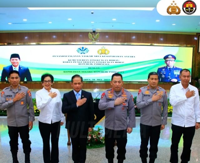 Kapolri, Jenderal Polisi Drs. Listyo Sigit Prabowo, M.Si., dan Menteri Lingkungan Hidup dan Kehutanan (LHK), Hanif Faisol Nurofiq menandatangani nota kesepahaman di Mabes Polri, Jakarta Selatan, Rabu (28/5).
