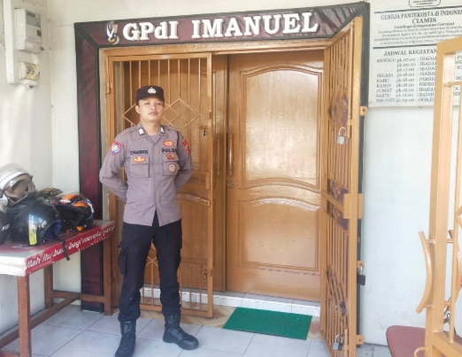 Personel gabungan Satuan Fungsi dan Polsek jajaran Polres Ciamis bersiaga melaksanakan pengamanan kegiatan keagamaan umat kristiani/nasrani di kawasan pusat kota Kabupaten Ciamis. Pengamanan ini salah satunya dilakukan pada Gereja Pantekosta di Indonesia (GPdI) Immanuel Ciamis, Jalan Ir. H. Juanda No. 231, Kelurahan Ciamis, Kecamatan Ciamis, Kabupaten Ciamis, Jawa Barat, Minggu (8/6/2025).