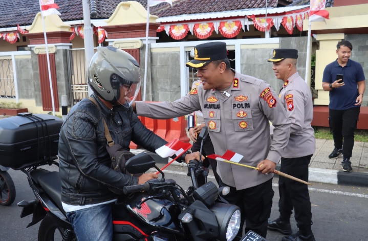 Menyambut Hari Ulang Tahun (HUT) ke-80 Kemerdekaan Republik Indonesia, Polres Ciamis menggelar aksi simpatik dengan membagikan bendera Merah Putih kepada para pengguna jalan. Aksi ini berlangsung di depan Markas Polres Ciamis, Jalan Jenderal Sudirman, Rabu (6/8/2025), sebagai ajakan langsung kepada masyarakat untuk bersama-sama menyemarakkan bulan kemerdekaan.