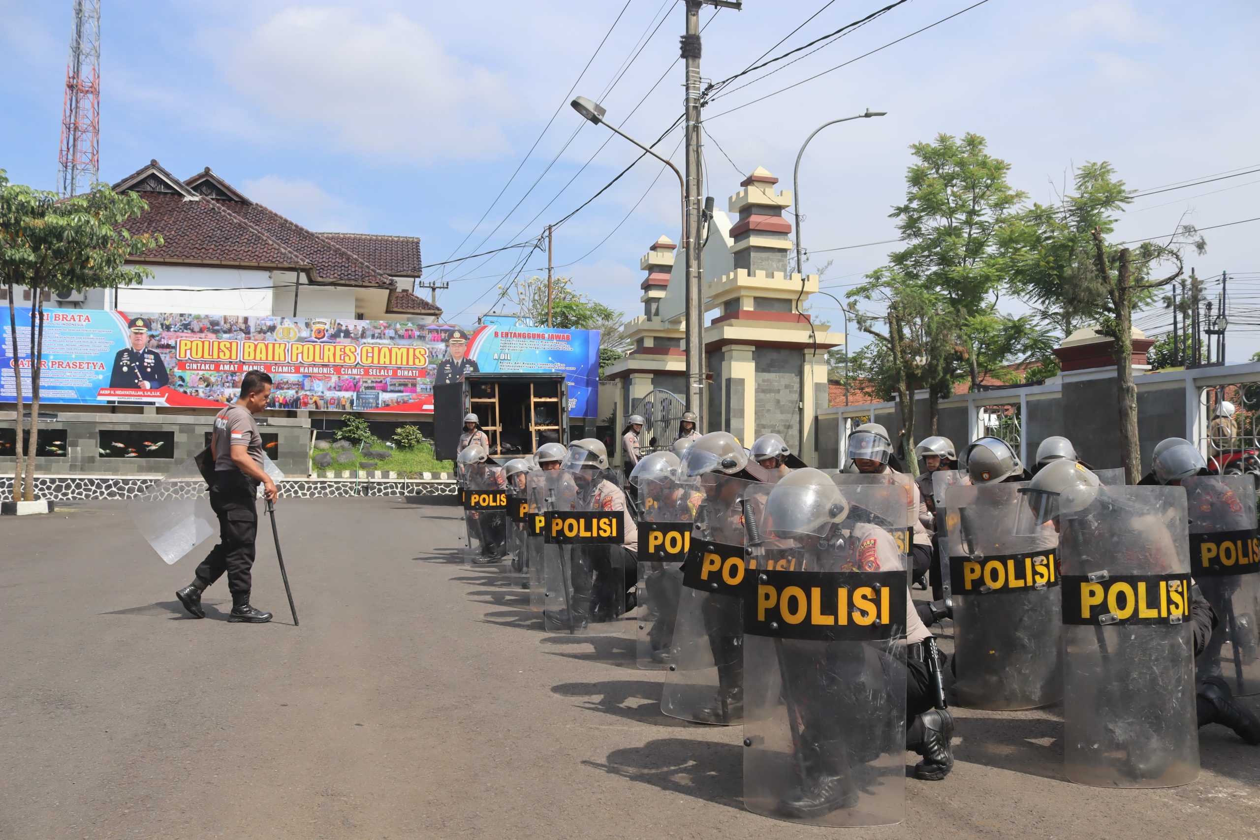 Polres Ciamis Polda Jabar menyiapkan personel dalam rangka penanggulangan serangan fisik ke Markas Kepolisian Polres Ciamis. Salah satu bentuk kesiapan yang dilakukan dengan meningkatkan setiap kemampuan personel Polri khususnya Satuan Samapta Polres Ciamis Polda Jabar. Puluhan personel disiapkan di halaman Apel Makopolres Ciamis, Jalan Jenderal Sudirman No.271, Sindangrasa, Ciamis, Kabupaten Ciamis, Jawa Barat, Rabu (24/9/2025).