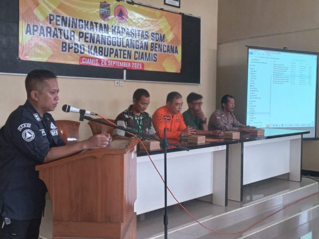 Personel Polsek Pamarican Polres Ciamis Polda Jabar menghadiri kegiatan sosialisasi mitigasi bencana bagi aparatur Kecamatan Pamarican. Kegiatan ini berlangsung di Aula Kantor Kecamatan Pamarican, Kabupaten Ciamis, Jawa Barat, Jumat (26/9/2025).