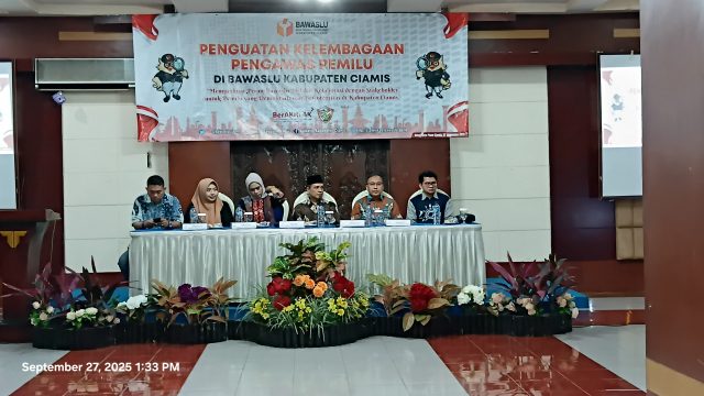 Badan Pengawas Pemilu (Bawaslu) Kabupaten Ciamis menyelenggarakan kegiatan Penguatan Kelembagaan Pengawas Pemilu di Hotel Tiara, Sabtu (27/9/2025). Forum ini menghadirkan unsur pemerintah daerah, partai politik, organisasi kepemudaan, pramuka, akademisi, hingga tokoh masyarakat.
