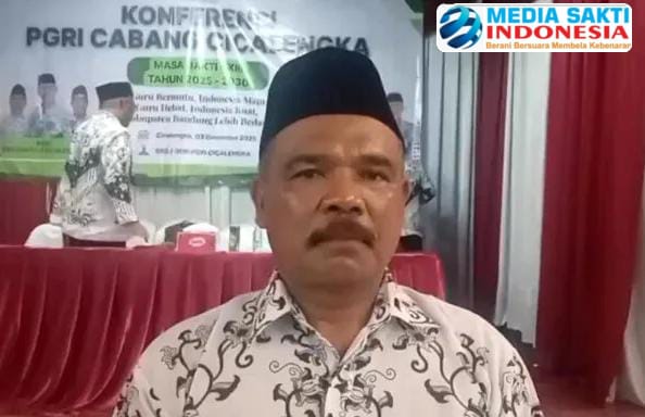 3 -12 -2025. Ketua yang terpilih untuk periode 2025-2030 PGRI Cabang Cicalengka saat memberikan keterangan seusai Konferensi Cabang PGRI di Gedung Serbaguna PGRI Cicalengka.