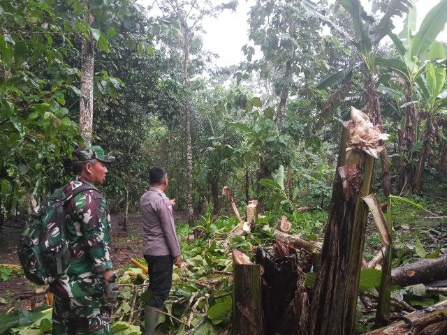 Personel Polsek Sukadana Polres Ciamis Polda Jabar secara humanis hadir ke masyarakat membantu warga evakuasi pohon tumbang yang menimpa bangunan rumah warga di Desa Bunter. Tepatnya rumah warga di Dusun Cikondang Rt.02 Rw.05, Desa Bunter, Kecamatan Sukadana, Kabupaten Ciamis, Jawa Barat, Senin, 22 Desember 2025, kemarin petang.