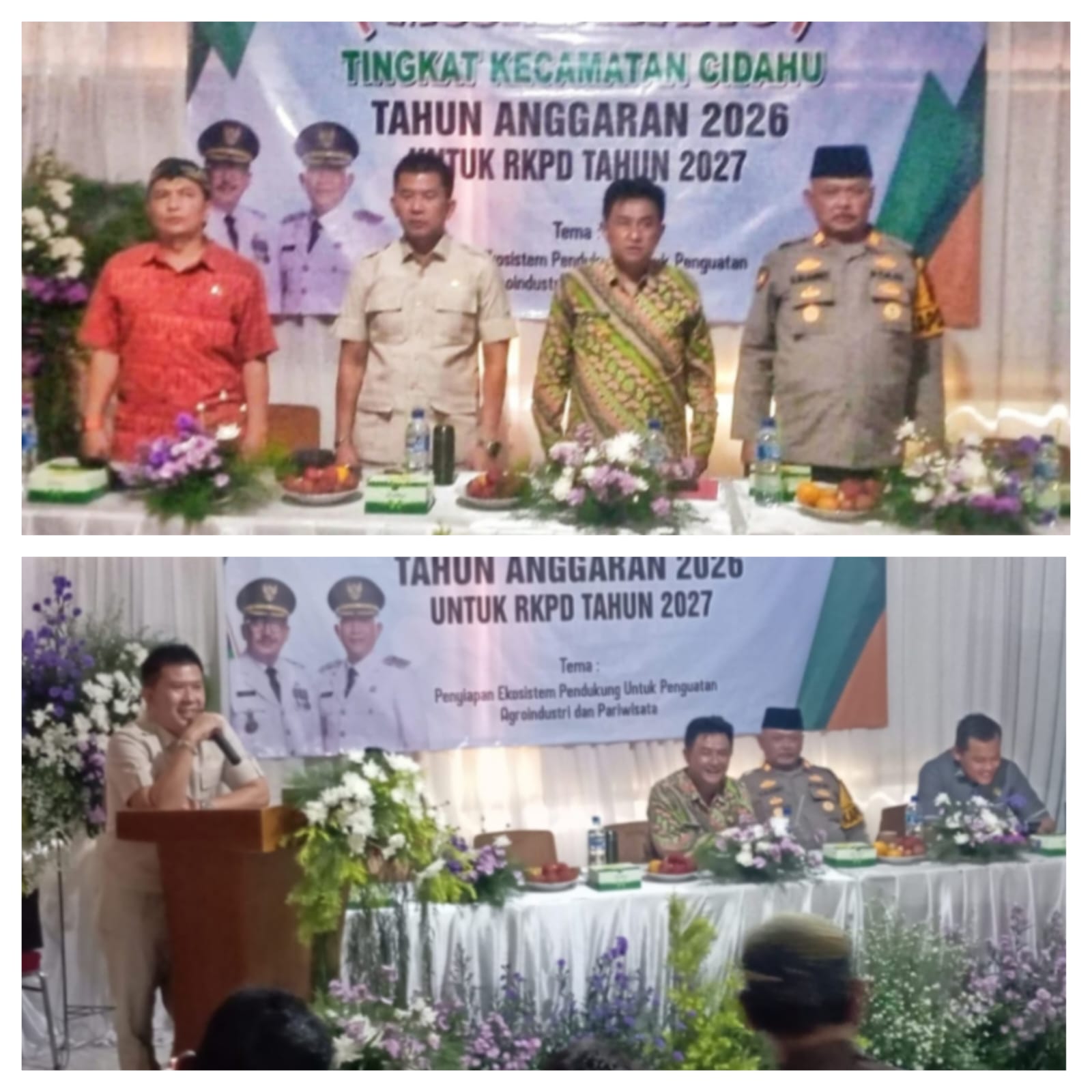 Dalam sambutannya, Camat Cidahu Tamtam Alamsyah, S.IP menegaskan bahwa Musrenbang merupakan forum strategis untuk menyerap aspirasi masyarakat dan menyelaraskannya dengan arah kebijakan pembangunan daerah. “Musrenbang ini menjadi momentum penting untuk merumuskan prioritas pembangunan tahun 2026-2027. Sesuai tema, kita ingin menyiapkan ekosistem pendukung yang kuat untuk penguatan agroindustri dan pariwisata di Kecamatan Cidahu. Potensi alam dan pertanian yang kita miliki harus mampu meningkatkan kesejahteraan masyarakat,” ujarnya.