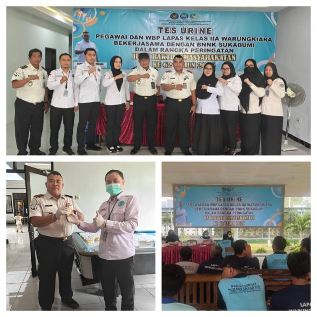 Lembaga Pemasyarakatan (Lapas) Kelas IIA Warungkiara melaksanakan kegiatan tes urine bagi petugas dan Warga Binaan Pemasyarakatan (WBP) dalam rangka memperingati Hari Bhakti Pemasyarakatan Tahun 2026. Kegiatan ini digelar pada Senin (06/04) mulai pukul 09.00 WIB hingga selesai, bertempat di Lapas Kelas IIA Warungkiara.Senin (06/04/2026)