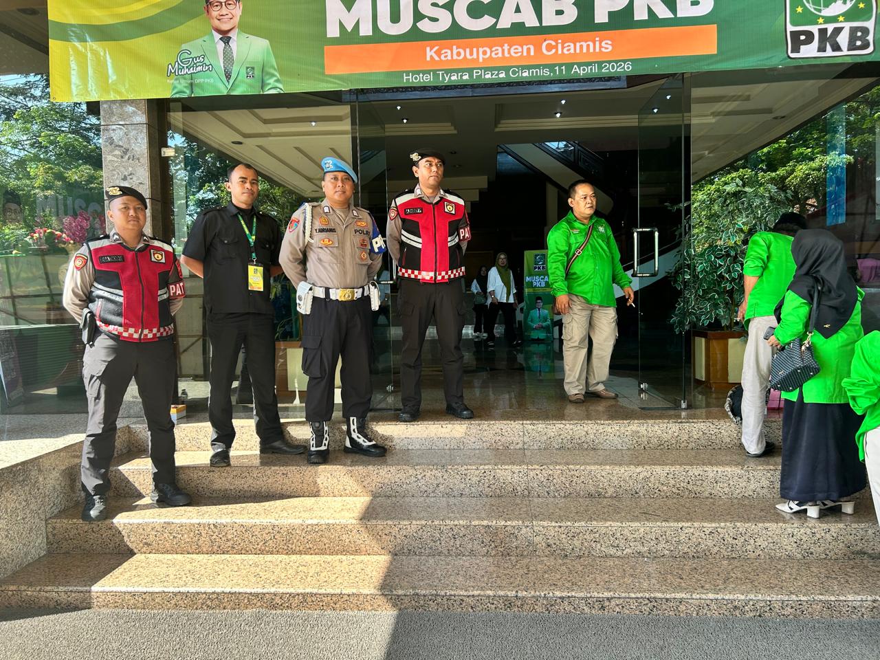 Satuan Samapta Polres Ciamis Polda Jabar turut bersiaga mengamankan gelaran Musyawarah Cabang (Muscab) Partai Kebangkitan Bangsa (PKB) Kabupaten Ciamis. Para personel bersiaga di kawasan Hotel Tyara, Jalan Jenderal Sudirman, Ciamis, Kabupaten Ciamis, Jawa Barat, Sabtu, 11 April 2026, kemarin.